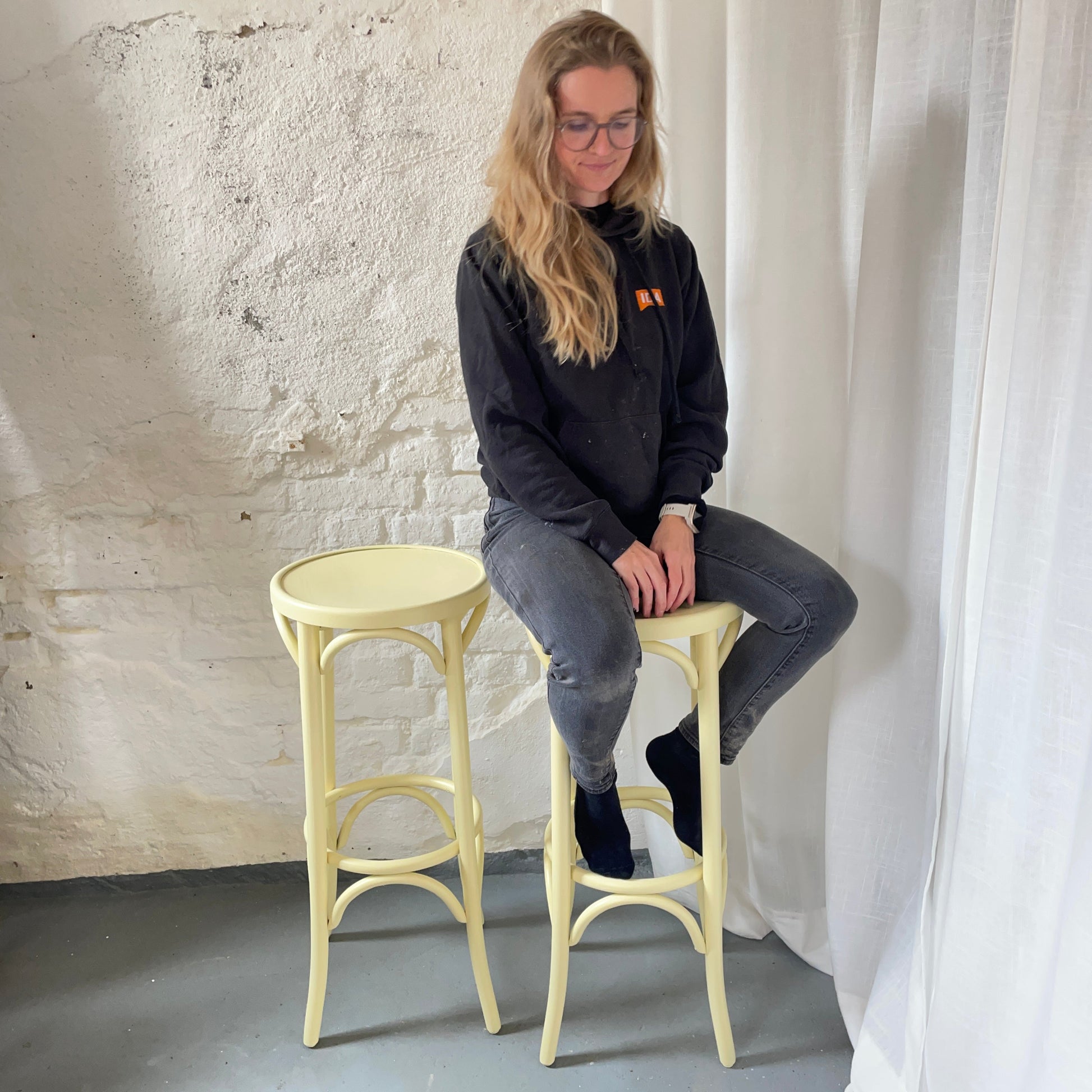Setze ein farbenfrohes Statement mit diesem einzigartigen Vintage Barhocker aus Bugholz Buche. Der Hocker wurde mit viel Liebe zum Detail aufbereitet und frisch in einem warmen Buttergelb lackiert – ein harmonischer Mix aus klassischem Design und moderner Frische.