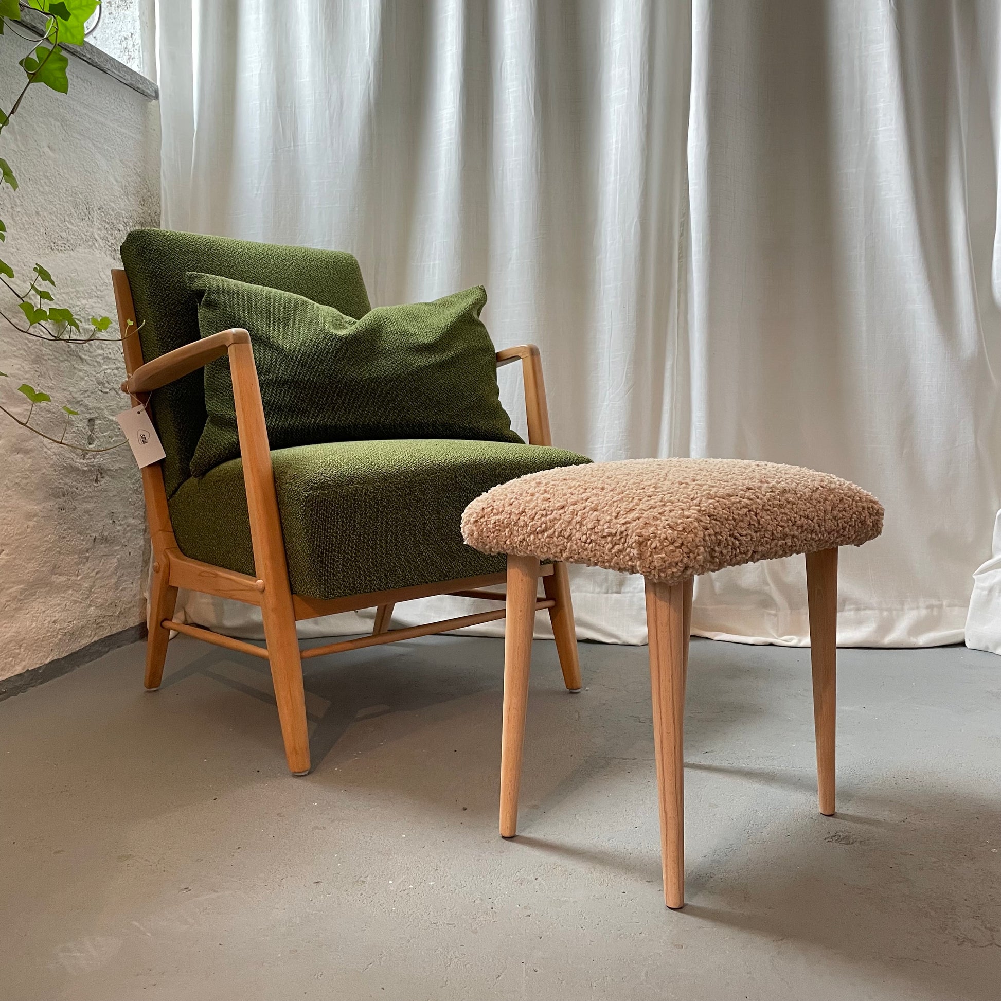 Dieser stilvolle Hocker verbindet minimalistisches Design mit höchstem Komfort. Es ist ein Modell aus den 60er oder 70er Jahren, welches wir liebevoll aufgearbeitet haben. Die Sitzfläche ist mit einem hochwertigen Bouclé-Stoff in einem warmen Beigeton neu bezogen, der durch seine weiche, strukturierte Oberfläche nicht nur optisch, sondern auch haptisch überzeugt. Die leicht ausgestellten Beine aus massivem Holz sorgen für Stabilität und verleihen dem Hocker durch die Behandlung mit weiß pigmentiertem Öl einen eleganten skandinavischen Look.