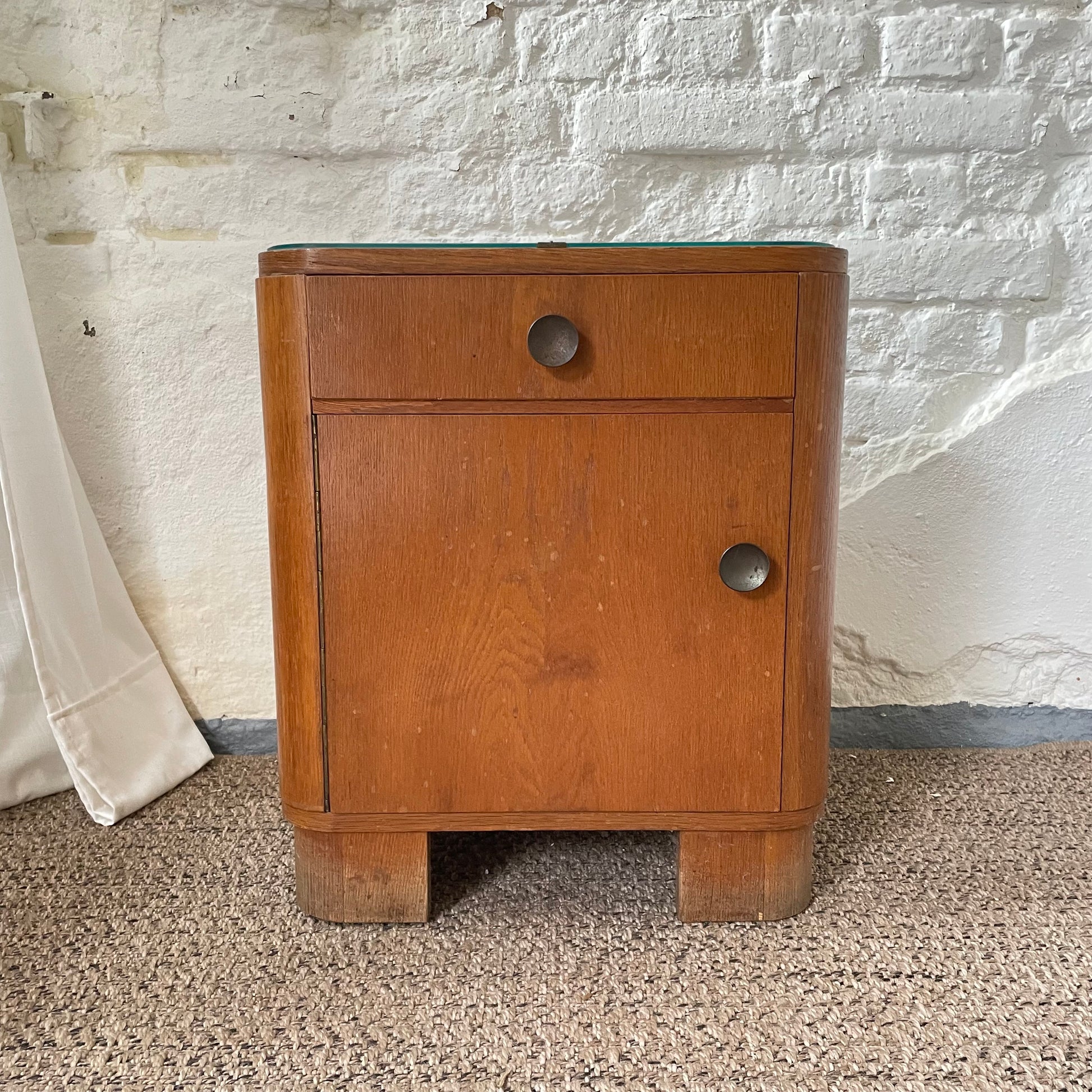 Dieser originale Nachttisch aus den 1950er Jahren ist ein charmantes Vintage-Möbel mit typischen, weich abgerundeten Seiten und klarer, zeitloser Formensprache. Ein echtes Stück Mid-Century-Design, das deinem Schlaf- oder Gästezimmer authentischen Charakter verleiht.