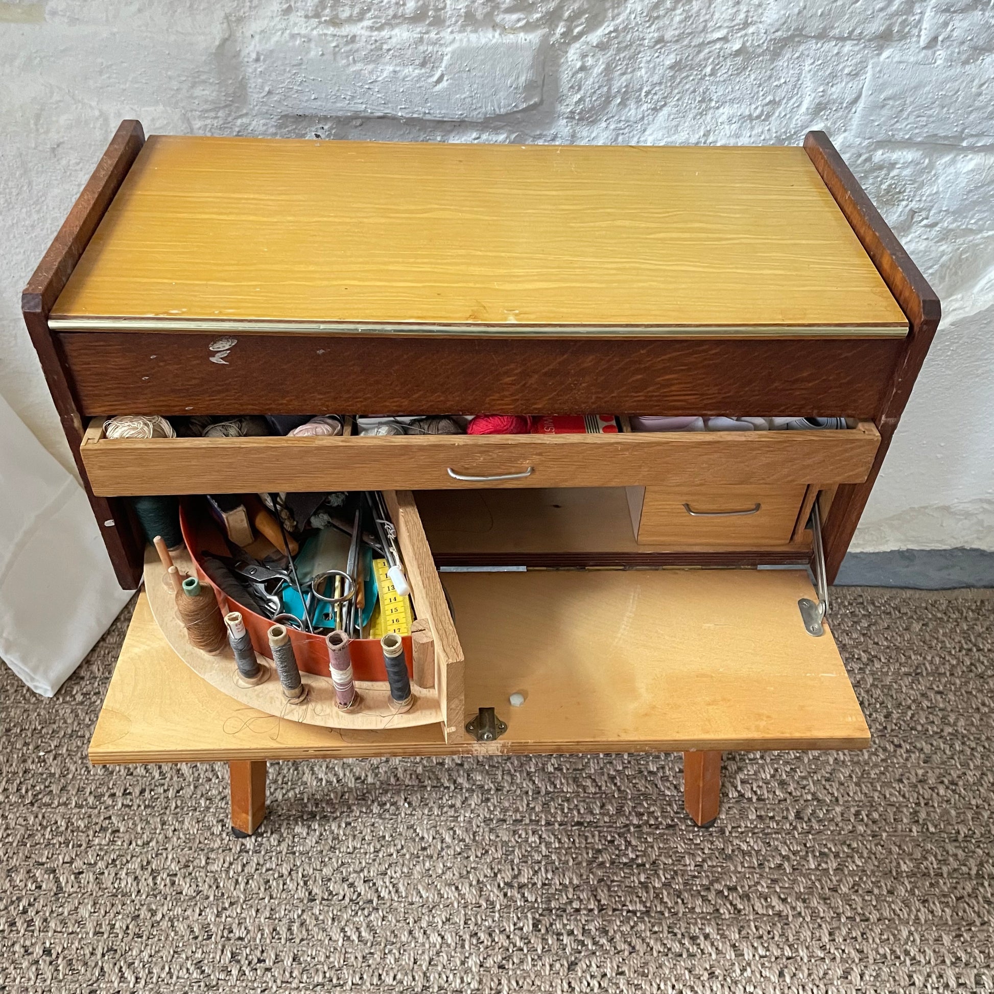 Dieses handaufgearbeitete Nähzubehör-Schränkchen ist ideal für alle, die praktische Aufbewahrung, nachhaltige Möbel und durchdachte Ordnungslösungen für den Hobbybereich suchen.