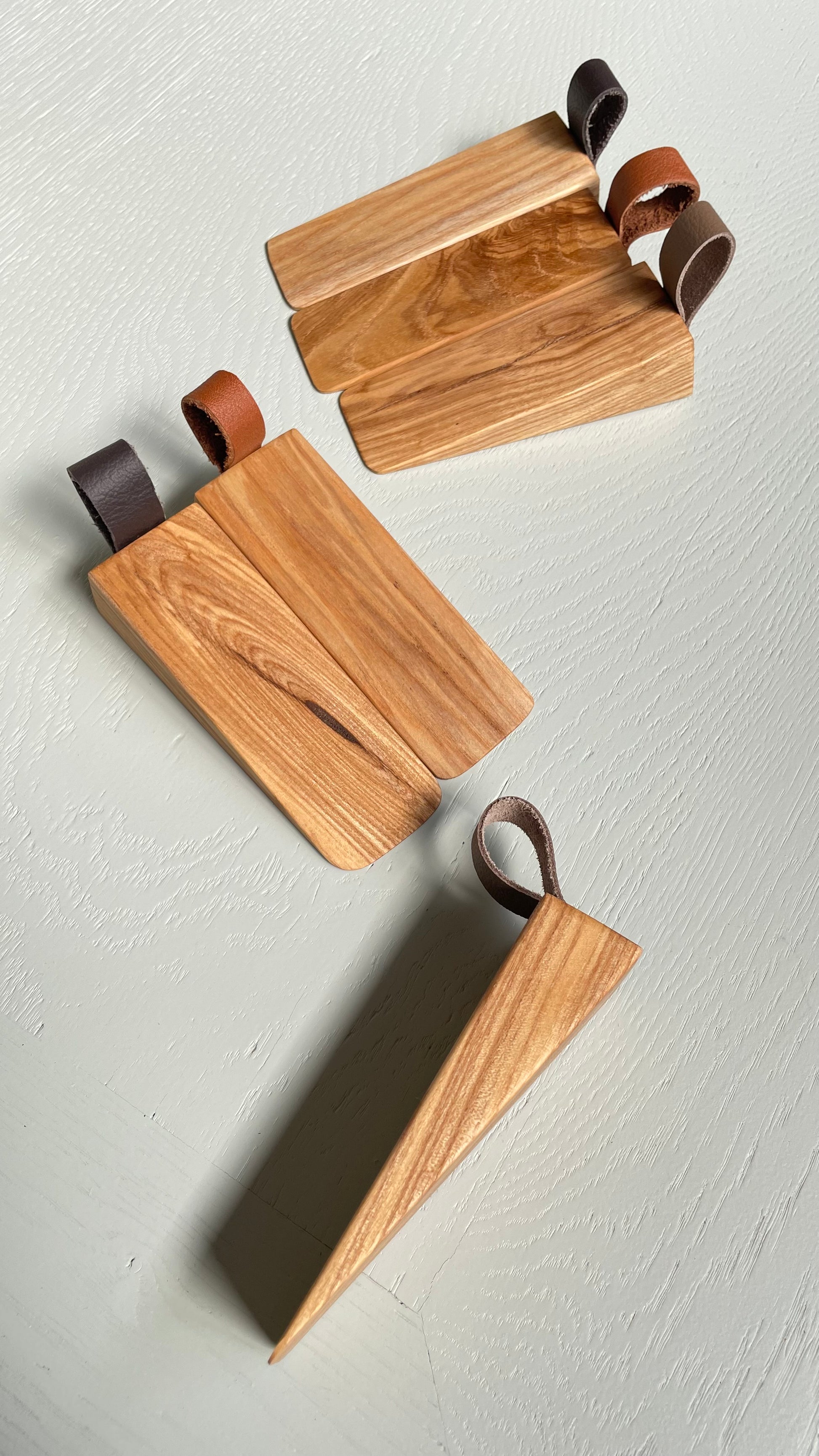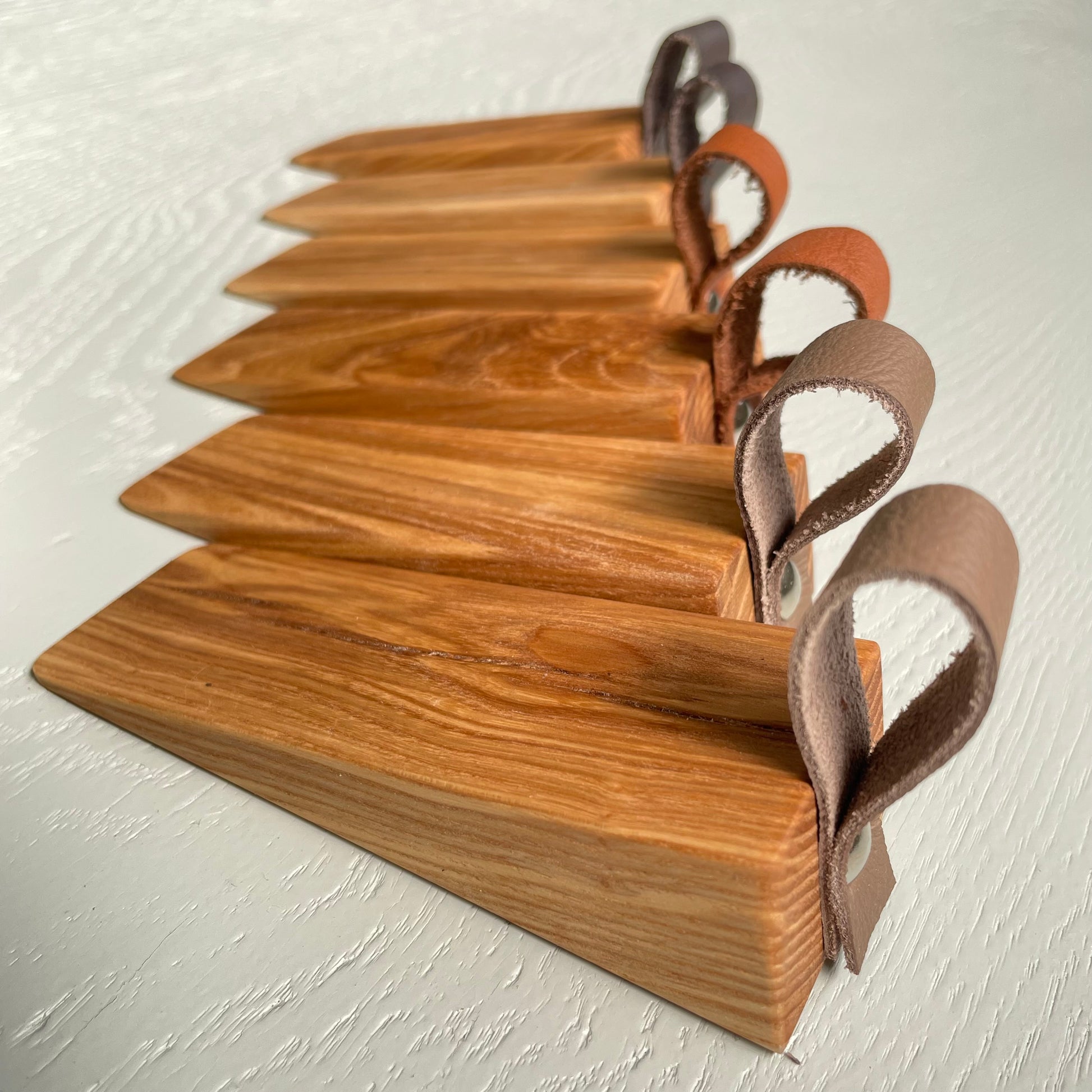 Holzkeile aus Verschnittresten mit Lederschlaufe