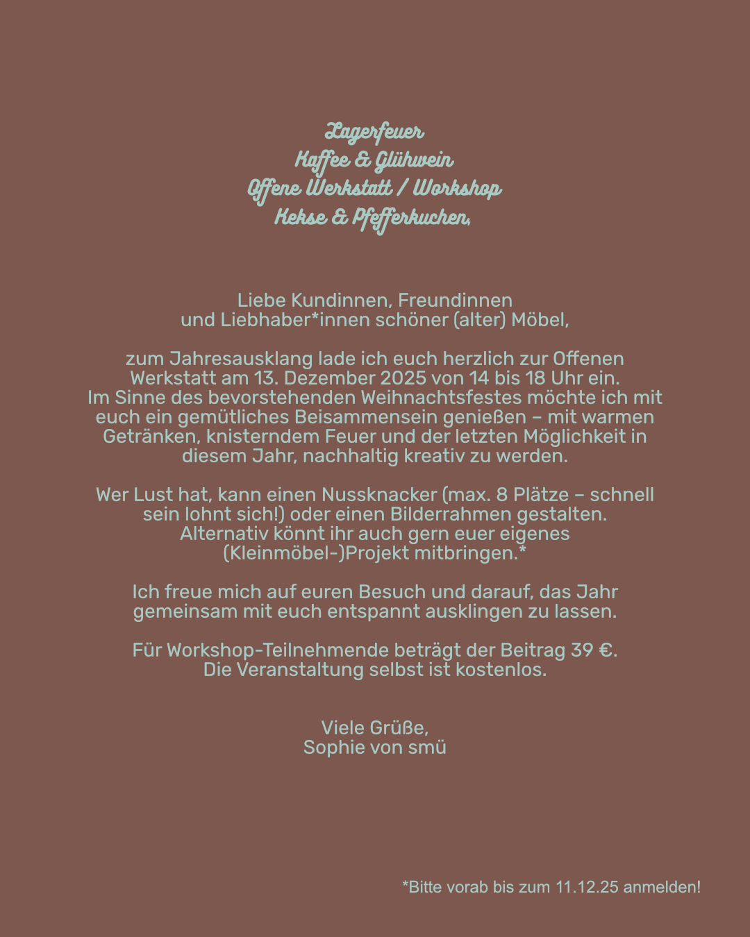 Buche einen Workshop deiner Wahl und lass uns nachhaltig kreativ sein! Der Kauf berechtigt dich zur einmaligen Teilnahme an einem der Workshops bei smü Design. Jeder Workshop versteht sich pro Person sowie inklusive Werkzeug, Material und Verpflegung zum angegebenen Termin.
